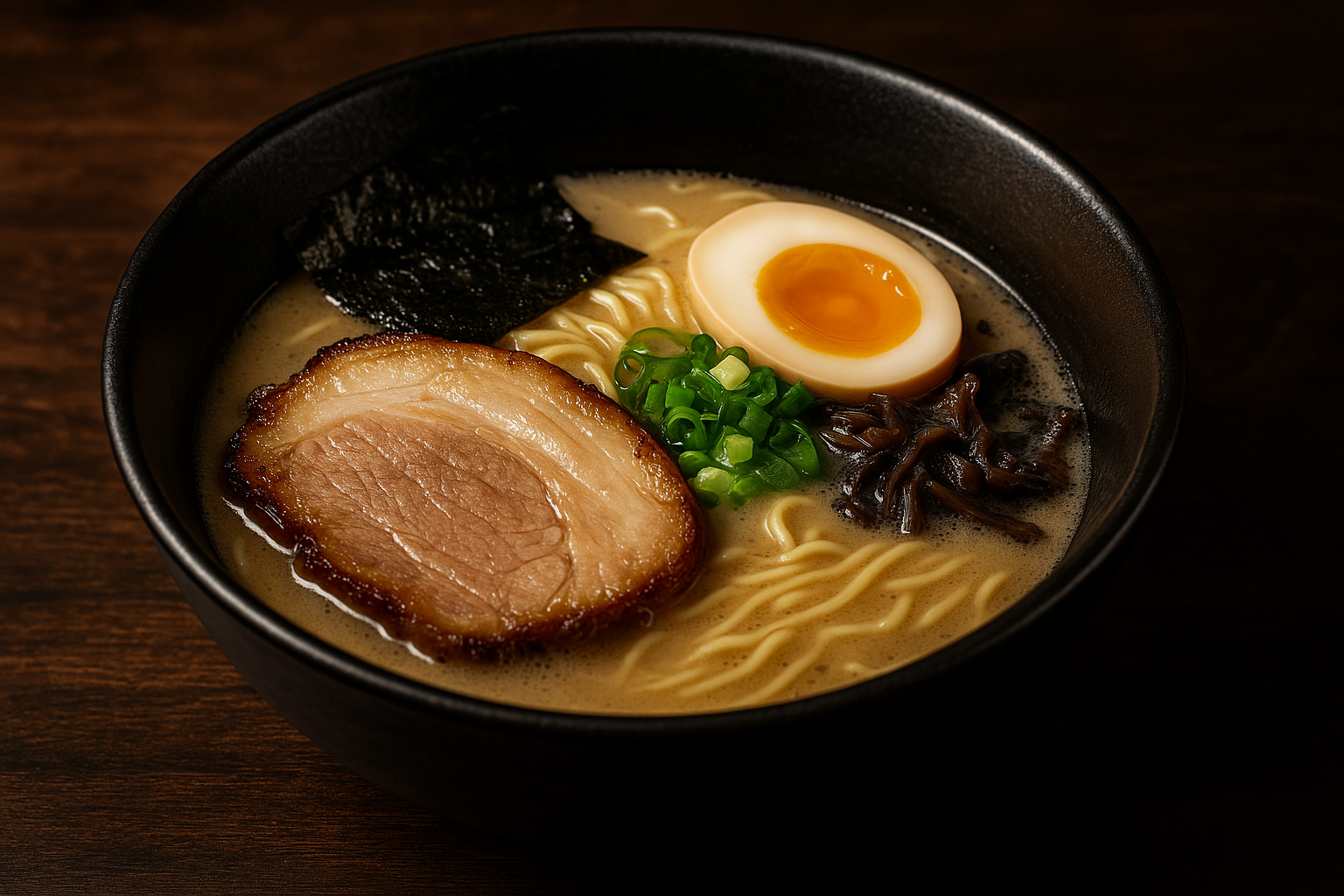 Pork belly, soft boiled egg, nori (seaweed), shiitake, green onion, black garlic...