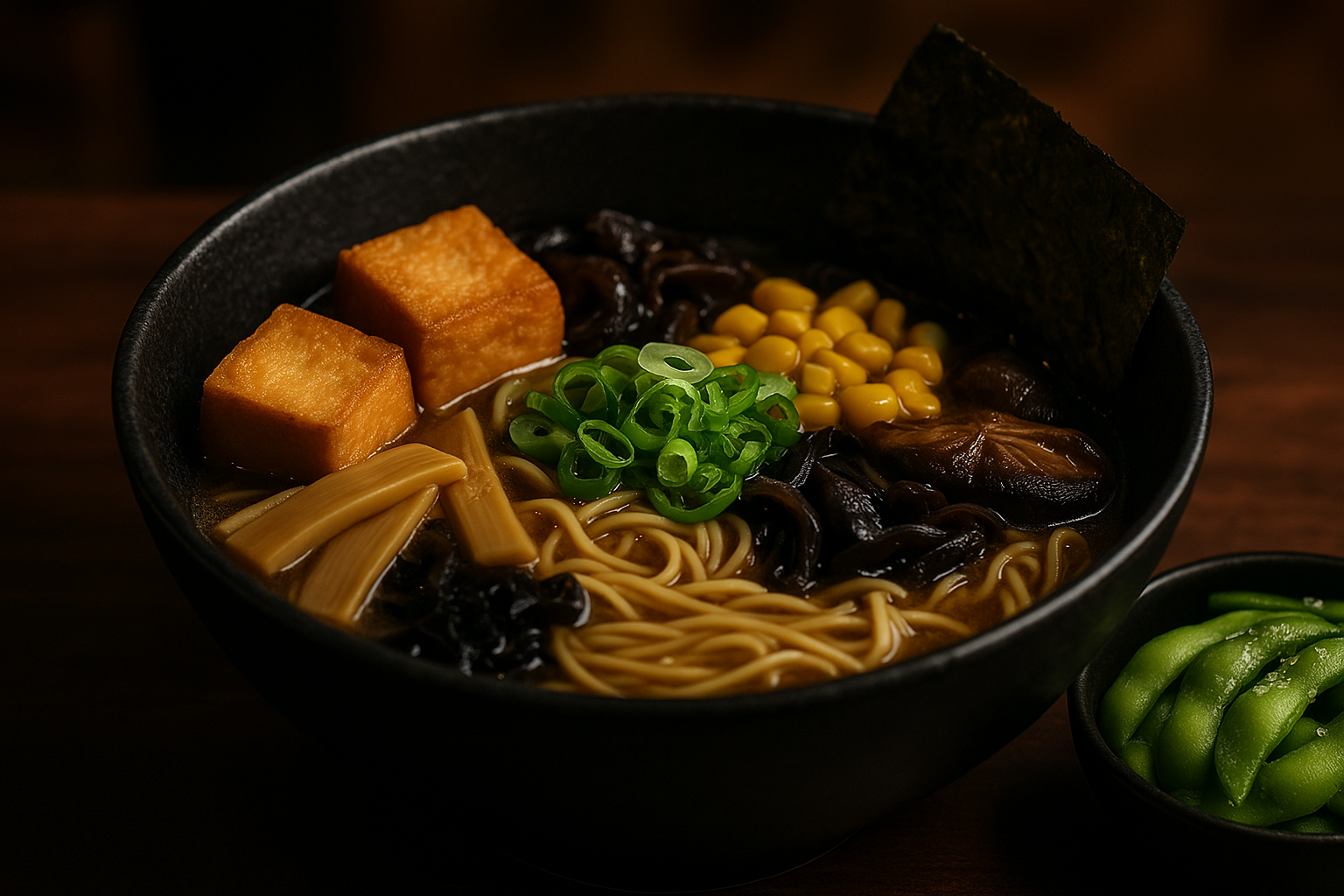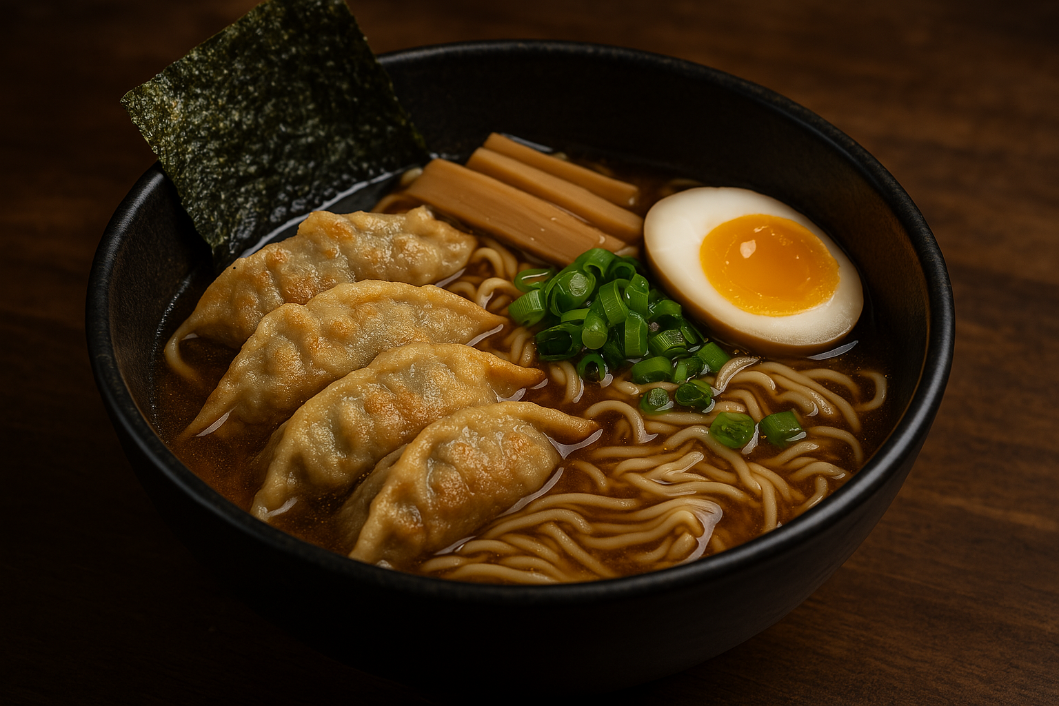Veggie gyoza (4pc), soft boiled egg, bamboo, nori (seaweed), green onion...